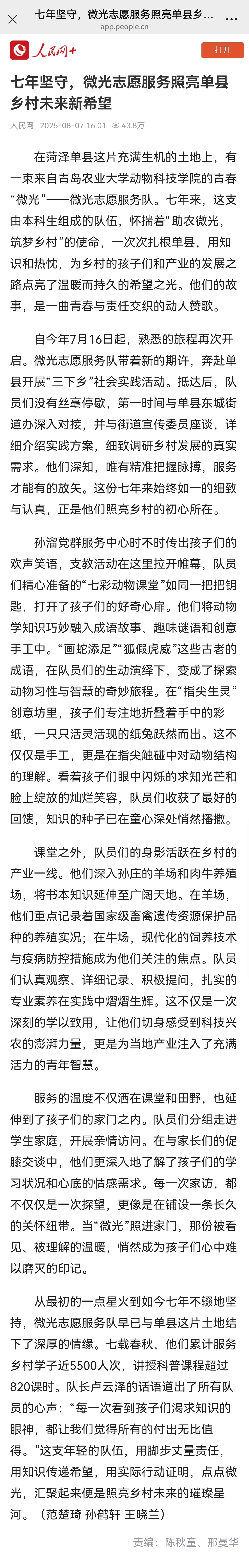 从最初的一点星火到如今七年不辍地坚持,微光志愿服务队早已与单县这片土地结下了深厚的情缘。七载春秋,他们累计服务乡村学子近5500人次,讲授科普课程超过820课时。队长卢云泽的话语道出了所有队员的心声:“每一次看到孩子们渴求知识的眼神,都让我们觉得所有的付出无比值得。”这支年轻的队伍,用脚步丈量责任,用知识传递希望,用实际行动证明,点点微光,汇聚起来便是照亮乡村未来的璀璨星河。