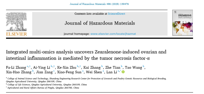 近日,bevictor1946韦德官网生猪种业创新团队李兰教授研究组在生猪健康养殖及饲料霉菌毒素毒害防治方面取得重要进展,相关成果以“Integrated multi-omics analysis uncovers Zearalenone-induced ovarian and intestinal inflammation is mediated by the tumor necrosis factor-α”为题,在线发表于《Journal of Hazardous Materials》 (一区top期刊,IF=11.3)。