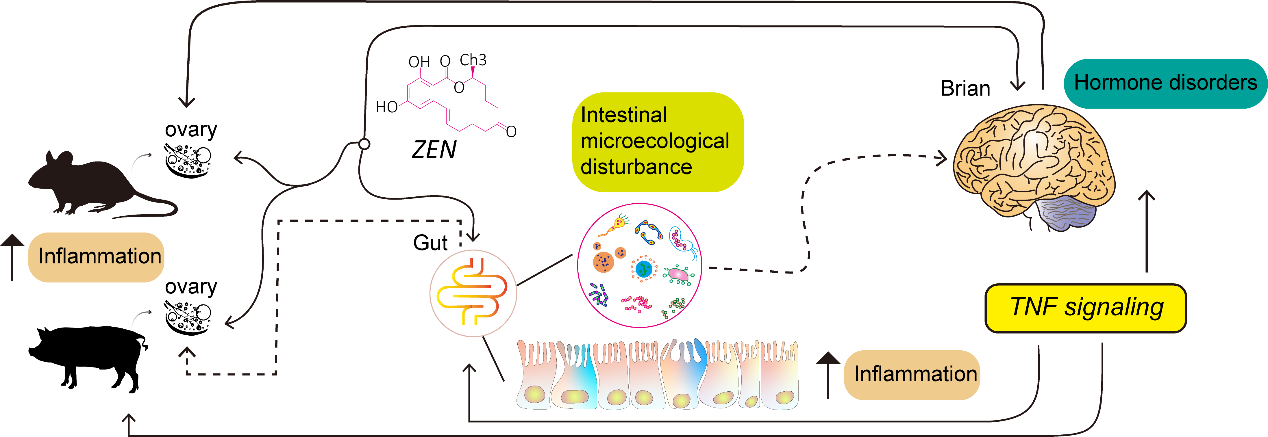 研究组通过建立体内体外模型、多组学联合分析、跨物种比较分析、多器官综合分析等方法,发现TNF信号通路介导的炎症反应是ZEN诱导卵巢和肠道损伤的关键信号通路。研究发现,ZEN暴露后,卵巢发育受损,卵泡发育关键蛋白BMP15、GDF9、LHX8的表达量降低;卵泡颗粒细胞凋亡水平增加;卵巢中炎症反应激活,包括TNF-α、NLRP3、IL6在内的多种促炎因子表达量上调。对于肠道来讲,ZEN暴露后肠道结构表现出损伤,且观察到炎症浸润。同时,肠道内促炎症蛋白表达上调;宏基因组学分析显示,肠道菌群紊乱可能与TNF信号通路相关。研究组进一步通过猪颗粒细胞和肠道上皮细胞RNA干扰实验和小鼠基因敲除实验证实TNF信号通路是ZEN暴露引起卵巢和肠道炎症的关键。此外,研究还发现,ZEN暴露还可以通过影响下丘脑基因表达导致激素水平紊乱诱发卵巢损伤。总之,这项工作深入解析了ZEN触发卵巢和肠道炎症反应的分子机制,这些结果将为减少ZEN相关霉菌毒素的毒害奠定理论基础。
