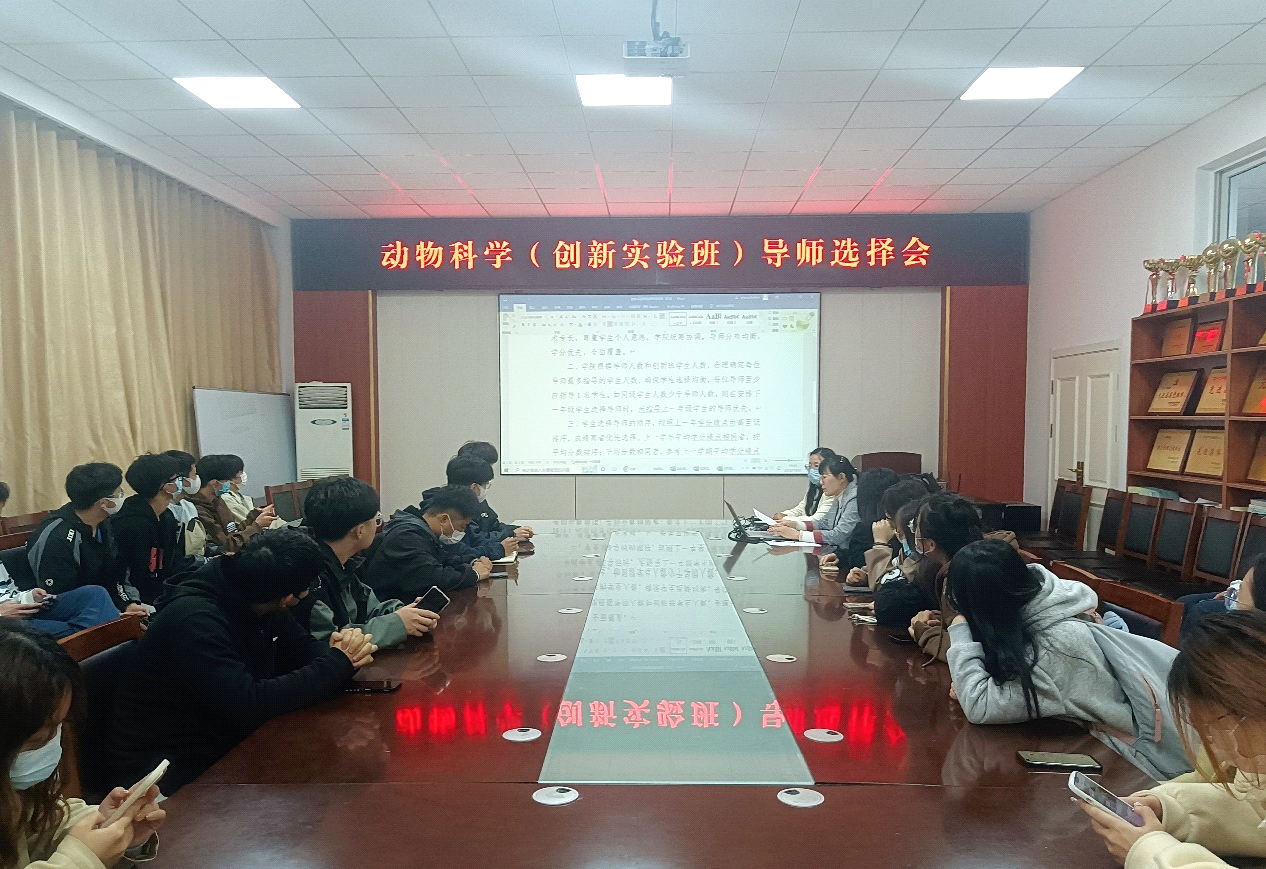 2022年10月27日,bevictor1946韦德官网在公司会议室召开动物科学专业创新人才实验班(以下简称“创新班”)导师选择会。会议由动物科学(创新实验班)专业负责人张贝贝副教授主持,2020级和2021级动科创新班的全体同学和班主任代表参加。